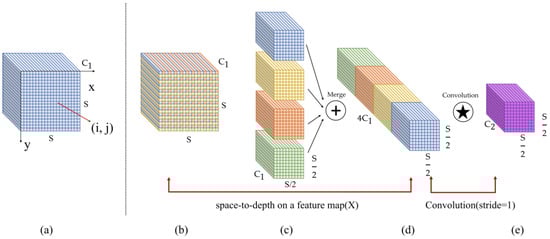 The role of the space-to-depth (SPD) layer is to reduce each spatial dimension of the input feature map to a channel dimension while preserving the information within the channel, which can be achieved by mapping each pixel or feature of the input feature map to a channel. In this process, the size of the spatial dimension is reduced while the size of the channel dimension is increased. For any feature map , it could be sliced into a sequence of sub-feature maps as follows: