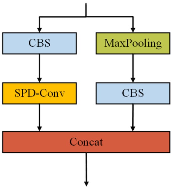 MP-SPD structure diagram. The CBS structure in one branch of the original MP architecture was replaced with SPD-Conv to enhance feature-extraction capability.