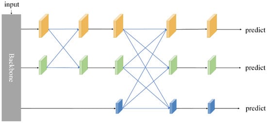 In object detection, multi-scale features are of great importance with various scales. Common strategies of multi-scale feature extraction, including conventional top-down and bottom-up feature pyramid networks such as FPNs (feature pyramid networks) or PANs (Path Aggression Networks), have the drawback of losing or degrading feature information and impairing the fusion effect of non-adjacent energy levels. An asymptotic feature pyramid network (AFPN) was proposed to solve the problems above []. The core idea of AFPN is to gradually integrate features from the bottom, middle, and top layers into the object-detection process through an asymptotic feature fusion strategy. The structure of AFPN is shown in Figure 5.