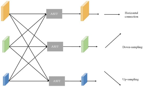 Just like many other feature pyramid networks, various levels of features are extracted from the backbone before feature fusion. In this paper, three different levels of feature, small, medium, and big, are extracted, represented as , , and , respectively. As the semantic gap between the non-adjacent levels is larger than the semantic gap between the adjacent levels, especially for the bottom and top levels, AFPN first fuses the and together in the first stage, then adds the last, which effectively circumvents the poor fusion of and and reduces the semantic gap between them. At the same time, ASFF [] is used to assign different weights for various levels of feature, the structure of which is shown in Figure 6. Introducing varying spatial weights during multi-level feature fusion enhances the importance of critical levels while suppressing the influence of conflicting information from different objects. This helps to improve detection performance, especially in handling conflicting information more effectively. As shown in Figure 6, there are 3 different levels of feature that need to be fused in this paper; stands for the feature vector at position (i, j) from the n to l level, and implies the output of the multi-level features’ adaptive spatial fusion. The relationship between the two can be expressed as follows: