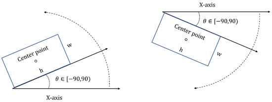 Target detection is commonly executed using a horizontal bounding box in most cases. Nevertheless, despite the varied acquisition angles of the pig image data, individual pigs are consistently depicted as elongated strips with diverse pose angles in the images. Furthermore, in some images, pigs are densely packed, causing overlap in the horizontal bounding boxes of the original YOLOv7, leading to inaccurate detection results and complicating feature extraction. Bounding boxes with angular dimensions have been utilized to enhance the extraction of rotational features in the task []. Gradually, rotated bounding boxes have been employed in various contexts. For instance, Ref. [] proposed a rotated and oriented bounding box method aimed at accurately and rapidly predicting the location and orientation of each individual pig. The oriented bounding box parameters characterize pig geometry and effectively track the facing direction of each pig with high accuracy. Therefore, the utilization of rotating bounding boxes for pig detection and counting holds considerable importance. The long-edge definition method [] is employed in this paper (Figure 7). The horizontal bounding box generally includes four parameters: x, y, w, and h, representing the coordinates of the central point, width, and height of the box, respectively. The five-parameter method with a 180° angular range includes an additional parameter θ, indicating the acute angle of the rotating coordinate system with respect to the x-axis. The clockwise direction is designated as a positive angle, while counterclockwise is specified as a negative angle, ranging from −90° to 90° [].
