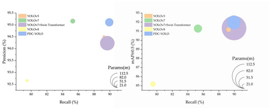 PDC-YOLO may not be as lightweight as YOLOv5 and YOLOv8 in terms of model size, but it notably surpasses other models in terms of mAP@0.5 and recall. While the YOLOv7 + Swin Transformer model approaches PDC-YOLO in terms of recall, its model parameters far exceed those of PDC-YOLO. Overall, PDC-YOLO achieves a commendable balance between model size and detection performance. The details are shown in Figure 8.