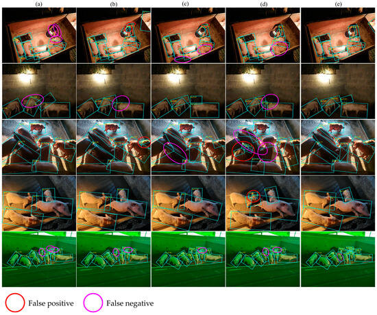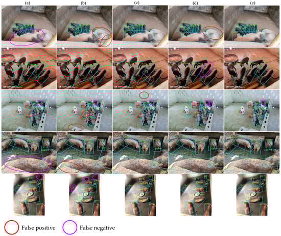 The detection performance of the 5 models under different patterned pigs. Column (a) is the detection performance of YOLOv5, Column (b) is the detection performance of YOLOv7, Column (c) is the detection performance of YOLOv7 with the Swin Transformer, Column (d) is the detection performance of YOLOv8, (e) is the detection performance of the proposed model.