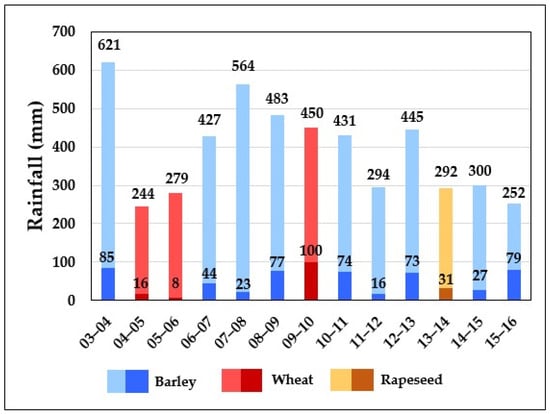 Total rainfall for the thirteen cropping seasons (from 2003–2004 to 2015–2016 and from September to August) and for the included period from March to April (dark colors). The cultivated crop (barley, wheat, or rapeseed) is specified for each cropping season.
