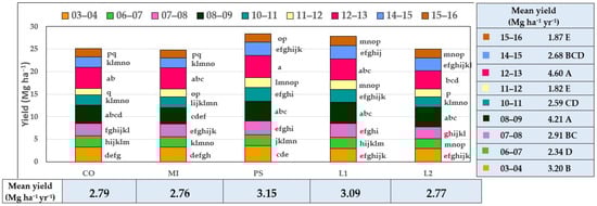 Barley grain yields for ninee cropping seasons (in different colors) and according to fertilization treatments at sowing (Fsow): control (CO), mineral N fertilizer (MI), pig slurry (PS), and composted sewage sludges (L1 and L2). An interaction between Fsow and cropping season (year) was found and means of the combination of both variables with different letters (from “a” to “q”) are significantly different according to the LSD test (p < 0.05). Means for cropping seasons with different letters (from “A” to “E”) are significantly different according to the LSD test (p < 0.05).