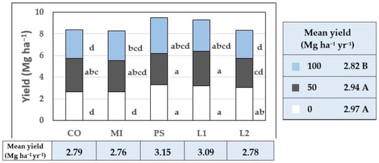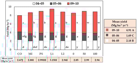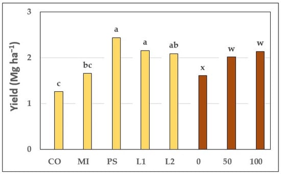 In wheat, no yield response to fertilization was recorded in the dry years (2005 and 2006 harvests; Figure 1 and Figure 4). In contrast, L1 achieved the highest yield at the end of a rainy cropping season (2010 harvest). In a humid year, a topdressing of 50 kg N ha−1 of mineral-N fertilizer can also be feasible. Thus, wheat mirrored barley’s behavior in terms of the profitability of residual N. In fact, barley and bread wheat respond similarly with regard to grain nitrogen content and water availability changes in the typical Mediterranean environmental conditions [].
