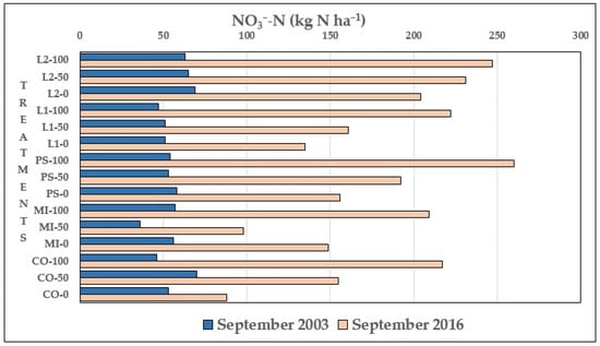 In the soil, the NO3−-N content, from 0 to 0.3 m, increased significantly from 2003 to 2016 (Table A2) irrespective of the fertilization treatment (Figure 6).