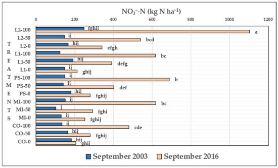 Nitrogen content (in nitrate form) in the profile (0–0.9 m) and according to the combined fertilization treatments at sowing (CO, control; MI, mineral; PS, pig slurry; and composted sewage sludges L1 and L2) and at topdressing (0, 50, and 100 kg N ha−1) in September 2003 and 2016. Mineral-N means with different letters (from “a” to “j”) are different according to the LSD test (p < 0.05).