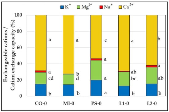 Exchangeable cations vs. cation exchange capacity after 19 years from the experiment establishment, for the fertilization treatments at sowing without topdressing: CO-0, control; MI-0, mineral; PS-0, pig slurry and composted sewage sludges (L1-0 and L2-0). For each cation, bars with different letters are different according to the DMRT (p = 0.05).