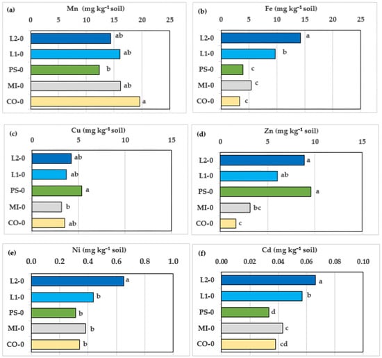 Availability of Mn (a), Fe (b), Cu (c), Zn (d), Ni (e), and Cd (f) extracted with DTPA after 19 years from the experiment establishment and for the different fertilization treatments at sowing without topdressing: CO-0, control; MI-0, mineral; PS-0, pig slurry, and composted sewage sludges (L1-0 and L2-0). Bars with different letters are different according to the DMRT (p = 0.05).