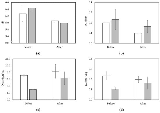 A low UI value indicates a well-mixed soil with a constant nutrient value in different soil layers. To validate the effect of UI, the chemical compositions of L1 and L5 before and after rotary operation were compared. The general chemical properties of the soil (including pH, EC, organic, phosphate, potassium, calcium, and magnesium) were analyzed based on the specific standard method [] (Figure 7).
