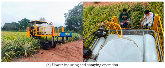 Field experiments were conducted at the Institute of Agricultural Machinery, Chinese Academy of Tropical Agricultural Sciences (21.159° N, 110.269° E) during 2024, to evaluate agricultural operations in pineapple cultivation. The comprehensive trials comprised three key components: (1) flower-promoting spray application, (2) fruit harvesting operations, and (3) postharvest transportation protocols. Figure 11 illustrates the experimental setup and field implementation of these mechanized agricultural processes. All trials were performed under standardized tropical conditions characteristic of the Leizhou Peninsula region, with temperature and humidity parameters recorded throughout the experimental periods to ensure environmental consistency. The average temperature is 17 ° C in February and 30 ° C in July.