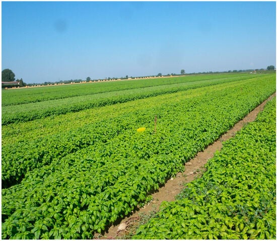 Italy is one of the top basil producers in the world, with approximately 800 ha []. The multiple cultivars grown and used in the Mediterranean area belong to Ocimum basilicum, which is one of the 64 species in the Ocimum genus []. O. basilicum, which is commonly known as sweet basil, is the most economically relevant species and is used for both fresh consumption and industrial food production, as well as for medicinal and cosmetic purposes.