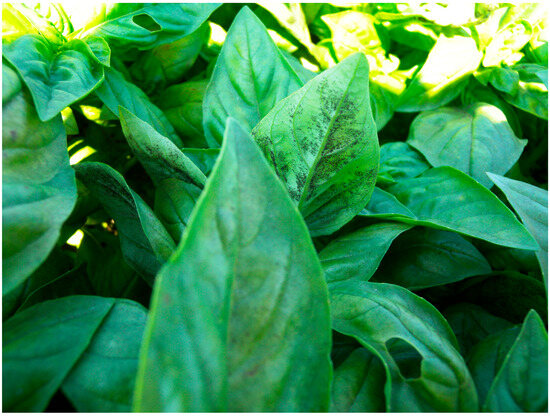 Downy mildew continues to be the cause of major basil losses; therefore, it represents a serious concern for farmers, despite the many studies that have been conducted in different parts of the world. Its management is difficult for a number of reasons. First, basil, as a minor crop, suffers from a chronic lack of registered, traditional crop-protection products. Although fungicides are often not the most desirable solution, they are of crucial importance in integrated pest management programs []. The control of downy mildew in conventional farming, when carried out under protection, is mainly based on the adoption of appropriate cultivation practices aimed at reducing leaf wetness [,] and on the application of fungicides.