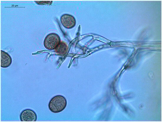 Sporulation in P. belbahrii typically occurs during periods of high humidity (≥85%) and moderate temperatures (15–25 °C), usually at night. The pathogen emerges from stomata on the abaxial (underside) surface of infected basil leaves (Figure 2), producing sporangiophores, which are branched structures that bear sporangia (Figure 3). These sporangia are lemon-shaped and colorless, and are the main dispersal units of the pathogen [,].