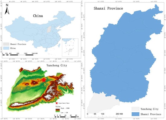 This study selected the experimental base in Wenxi County, Yuncheng City, Shanxi Province, as the research area (35°18′ N, 111°13′ E) (Figure 1). The region has a temperate continental climate with an annual average temperature of approximately 13.5 °C and annual average precipitation of approximately 550 mm, mainly concentrated in June–September. The soil types are mainly loam and sandy loam, with typical characteristics of the Loess Plateau transition zone, suitable for conducting soil moisture monitoring and modeling research.