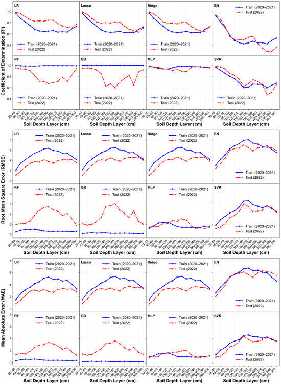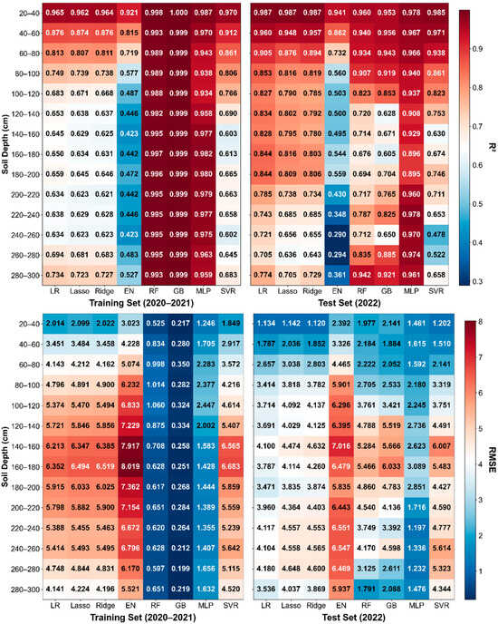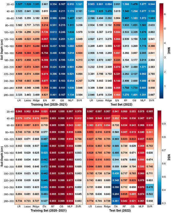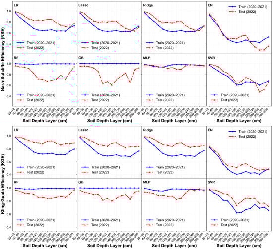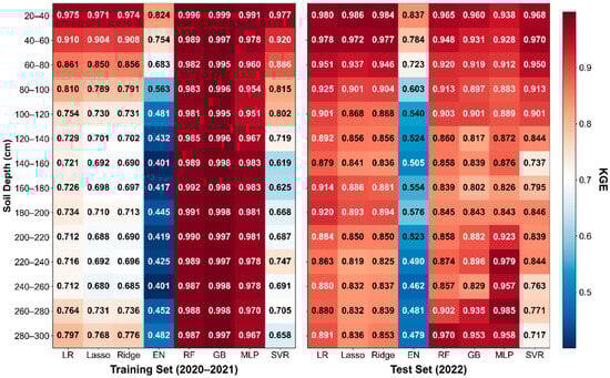 The performance evaluation of eight machine learning models across 14 soil depth layers (20–300 cm) under temporal validation is shown in Figure 4, displaying R2, RMSE, MAE, NSE, and KGE metrics for the training set (2020–2021) and test set (2022). MLP dominated test set performance, achieving optimal R2 in 10 out of 14 depth layers: shallow layers (20–80 cm: R2 0.966–0.978), middle layers (80–180 cm: R2 0.895–0.940), and deep layers (200–280 cm: R2 0.960–0.974), where other models degraded. Linear regression excelled at surface layers (20–40 cm: R2 0.987), and SVR at 40–60 cm (R2 0.971).