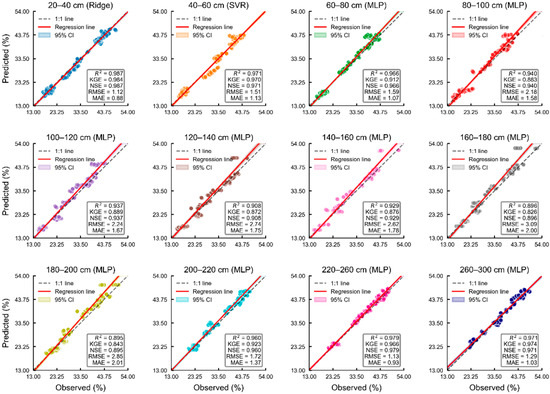 The “depth-specific optimal model selection” characteristics exhibited by different models at different depth layers revealed the hierarchical nature of soil moisture spatial heterogeneity and temporal stability. Multi-layer perceptron dominated 60–300 cm depths (R2 = 0.895–0.978), demonstrating strong capability in capturing complex temporal patterns in middle and deep layers. Ridge Regression performed optimally in the 20–40 cm shallow layer (R2 = 0.987), while support vector regression stood out at 40–60 cm (R2 = 0.971), reflecting different algorithms’ differential adaptive capabilities to depth-stratified temporal dynamics. The superior performance of non-linear models in deep layers under temporal validation indicates their enhanced ability to capture long-term moisture accumulation patterns independent of training period, which is critical for future predictions.