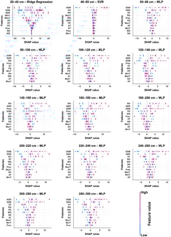 SHAP analysis was used to quantify the contribution magnitude and direction of each input feature in predicting soil moisture at different depths. The analysis objects were the optimal performing models at each soil depth layer (0–300 cm), calculating SHAP values for input features on test set sample prediction outputs. Features included 0–20 cm surface soil moisture and 10 meteorological variables processed by sliding windows. The positive and negative values of SHAP values measure the positive or negative contribution of features to prediction results, with absolute values reflecting variable importance.