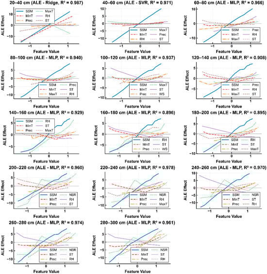 ALE analysis eliminated feature correlation biases in meteorological variables, achieving high predictive accuracy (R2 = 0.895–0.987) across 14 depth layers (Figure 7). Surface soil moisture exhibited strong positive linear effects with ALE magnitudes increasing from 8–10 units in shallow layers (20–80 cm) to 12–18 units in deep layers (200–300 cm), confirming the “surface-to-deep information transmission amplification” mechanism. Minimum temperature showed consistent negative responses with ALEs of −8 to 0 units in shallow layers and −5 to 0 units in deep layers, while maximum temperature exhibited positive responses in shallow layers (20–80 cm) with ALEs of −3 to +5 units. Precipitation showed gentle positive responses in shallow layers (20–140 cm) with ALE magnitudes of 2–4 units, while relative humidity dominated middle layers (100–200 cm) with stable patterns and fluctuations of ±3 units. Net solar radiation emerged in deep layers (200–300 cm) with gentle positive slopes showing ALE increases of 4–7 units. Critical transition zones at 160–180 cm and 180–200 cm exhibited relative humidity with positive responses where ALEs increased from −3 to +6 units, identifying threshold-driven moisture dynamics that explain discrepancies between surface remote sensing observations and ground-truth measurements.