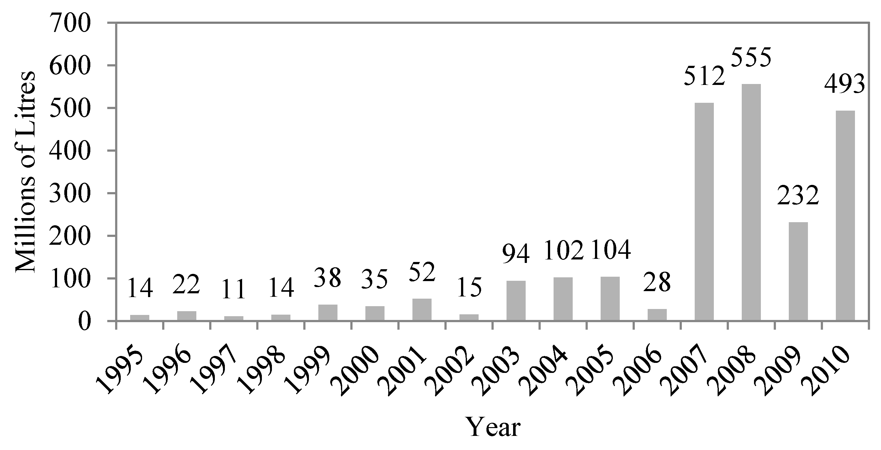 Canadian ethyl alcohol imports in millions of litres, 1995–2010 [21].
