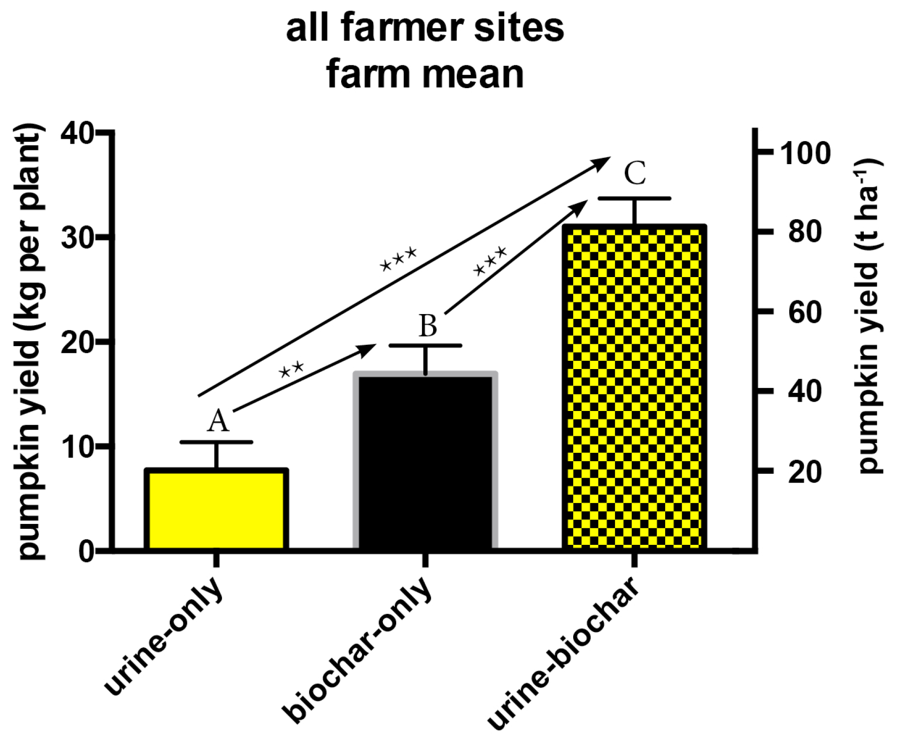 Mean pumpkin yield of all farmer sites. Notes: Mean pumpkin yield of all farmer sites in kg per plant and t·ha−1. The statistic analysis was calculated with the linear mixed effects models (lmer), including the site-specific random effects of the eight sites. Codes of significance are *** for p < 0.001 and ** for p < 0.01. The yield in t·ha−1 was calculated with a plant density of 2630 plants·ha−1.