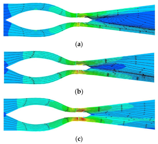 Streamlines and velocity contour on cross section in shaft rear-positioned tubular pump device: (a) Q/Qd = 0.8; (b) Q/Qd = 1.0; (c) Q/Qd = 1.2.
