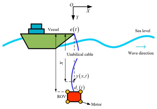 Underwater robots are now most frequently used in the exploration and exploitation of marine resources, widening their use in engineering fields [,,,,] due to the rapid growth of remote operated vehicle (ROV) in information interaction, depth in working, and recycling, etc. The motor-driven deep-sea robot cable system (MDRCS) is a cascade system made up of an offshore vessel, a flexible cable, a ROV, and motors in Figure 1. Numerous studies on the suppression of vibrations in flexible deep-sea bodies have been started by scientists because flexible umbilical cable is prone to vibration, which affects the operating environment of the ROV [,,].