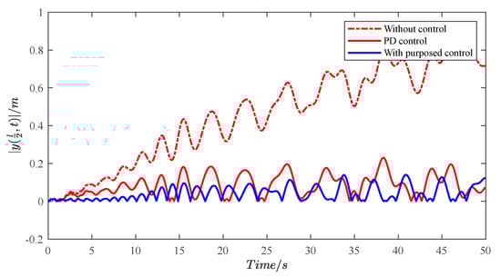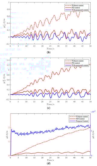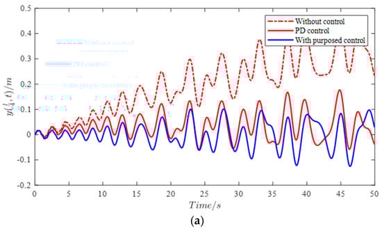 The proposed control Equation (22) with the control gains: , . The boundary vibration of MDRCS is displayed in Figure 3, and the parameters of the system are specified in Table 2.