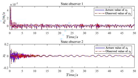 In the Figure 3, four positions transversal vibration of the umbilical cable obtained by numerical analysis is shown. It is obvious that the vibration increases with both time and position without control, and all positions transversal vibration can be suppressed by PD controller (66) and proposed controller (22). In particular, the control objective is to eliminate vibration of the boundary of the umbilical cable, so the control error is equivalent to the vibration for MDRCS. On this premise, it is obvious that the control performance of the proposed controller is better than PD control at the boundary of the umbilical cable, but it is not clear at the other positions. The absolute value of vibration at midpoint of the umbilical cable is shown is Figure 4, it demonstrates the designed controller is significantly better than the PD control by the vibration amplitude. Moreover, the unknown state value is used in PD controller, which makes it limited in practical applications. In contrast, the proposed control which uses high-gain state observers in the design is not subject to this restriction. The results of the high-gain state observers are shown in Figure 5.