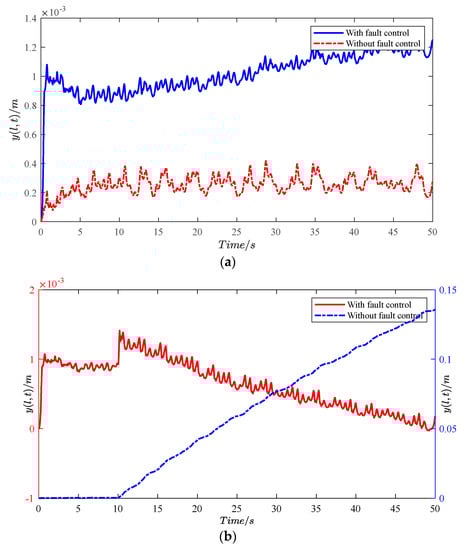 In this section, the numerical solution obtained by the finite difference method of the system verified the performance of the cascade control design in the presence of actuator fault, external interference, and variable length. First of all, the numerical results of boundary transversal vibration of MDRCS under the following controllers are compared, for the purpose of proving the validity of the proposed control (22).