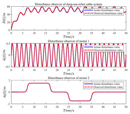 To better suit actual ocean disturbances, including ocean currents and waves, the unknown boundary disturbance of the deep-sea robot cable system is designed as trigonometric series. ROV has both moving and stationary states when working in the deep sea, so the disturbances are designed as a high-frequency trigonometric function and low-frequency generalized bell-shaped function for the two motors, respectively.