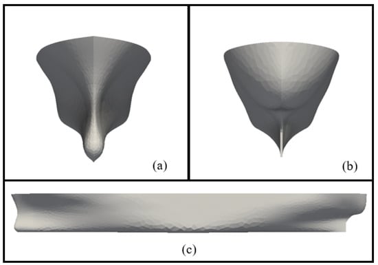 An increase in ship size tends to make the hull more “flexible” and leads to the wave encounter frequency being closer to the ship’s wetted natural frequency. In such resonance frequency, comparatively small vibration-induced loads are superposed to the wave-induced load that may significantly violate the ship motions and deform the ship structure. This phenomenon is called the ship’s hydroelastic effect, which is particularly important in determining design wave loads and structure strength evaluation of large ships []. The prediction of slamming loads on a deformable ship is a very challenging subject due to the strongly nonlinear free surface and the structure elastic behaviour. In such cases, the deformed ship structure interacts with the surrounding flow fields, which form a fully coupled fluid–structure interaction (FSI) system against the traditional rigid ship assumption. Hirdaris [], Jiao [], and Bakti [] also supported this point of view, showing that the rigid body model may lead to inaccurate predictions of hydrodynamic loadings as well as the global ship motions. Therefore, as suggested by Hirdaris [], a fully coupled FSI approach was used in this study to predict the flexible ship motions and hydrodynamic loads of an S175 containership in extreme wave conditions.