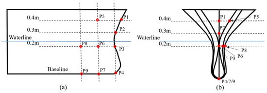 In this research, an array of six pressure gauges (P1, P2, P3, P4, P7, P9) were placed on the bow flare and bow bottom areas for bow wave pressure measurement to investigate the impact wave loads on the ship when sailing in harsh weather conditions, as shown in Figure 2a. Moreover, an array of three pressure gauges (P5, P6, P8) were arranged at the side of the hull to measure the slamming pressure at the starboard as shown in Figure 2b.