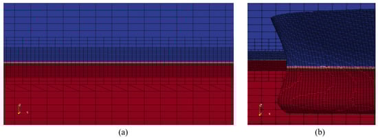 Mesh refinement. (a) Near the free surface. (b) Details at the ship bow.