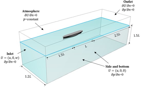 The boundary conditions in the present CFD study are shown in Figure 4 as follows. At the left boundary inlet, the velocity inlet was prescribed as the incident wave and current, whereas the pressure was set as a zero gradient. At the right boundary outlet, the current velocity outlet was applied to preserve the conservative of flux inside the computational domain. The boundary condition of the domain top part was set as the atmosphere. The lateral sides were set as symmetry planes to avoid wave reflection at the boundaries. The bottom boundary was set as a symmetry plane for deep-water modelling. The moving wall boundary condition with zero pressure gradient was defined on the surface of the ship hull.