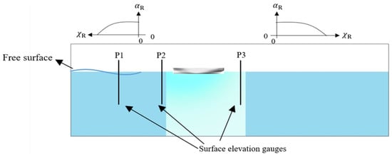 An open-source toolbox “waves2Foam” was used in this study to generate and absorb free surface waves in the computational domain []. A relaxation zone technique was adopted to provide better wave quality and to remove spurious reflection from numerical simulations. Two relaxation zones were placed at the inlet and outlet boundaries of the numerical wave tank. Equations (4) and (5) specify the main functions of the relaxation zone technique. We have