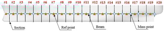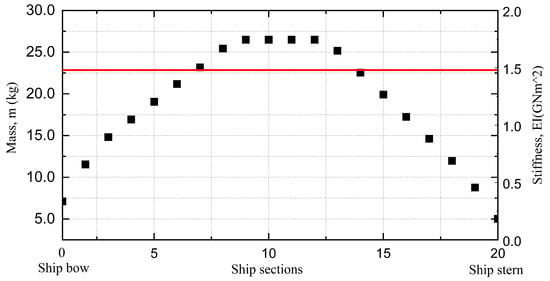 The deformable ship hull was divided into 20 sections whereas a stiffness matrix based on the Euler–Bernoulli beam theory, equivalently representing the structure’s stiffness, was employed to connect the neighbouring sections. In its numerical representation in MBDyn, the distributed mass of each ship section was modelled as a lumped mass point located at its centre of gravity according to the mass distribution data from [], as shown in Figure 7 and Figure 8. A uniform beam stiffness was applied with vertical bending stiffness, which is shown in Figure 8. The mass moment of inertia, , , and of each ship section was calculated based on the simplified approach from Bakti []. In their approach, the moment of inertia of each section (,,) was calculated by the product of the first moment of area and the centroidal distance of the area from the given axis. The parallel axis theorem was applied when the centre of the ship cross-section was not coincident with the beam node. Afterward, the moment of inertia can be calculated by using geometric properties of the cross-section by multiplying a factor of a, such that = . The factor a = 8.0 was used in this study, which was determined by matching the first two natural frequencies of the vertical bending modes of the beam with the values calculated by FEM. The material property of the beam was defined as steel, i.e., elastic stiffness E = 210 Gpa and Poisson ratio v = 0.3. In this study, the structural damping was estimated approximately as 1% of the critical damping, as recommended by [].