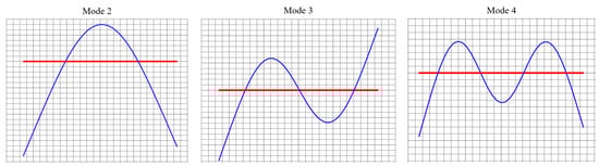 Before the hydroelastic computation, the modal analysis of the DMB beam model was conducted by using arpack solver in MBDyn software to provide information about beam vibration behaviour, such as the natural frequencies and modal shapes in the dry condition. The beam was assumed in a vacuum condition, and the elastic behaviours were considered by the multibody dynamic beam theory with equivalent beam stiffness. The beam section profiles (including section dimensions and thickness) were calibrated by matching the first three modes’ natural frequencies with the natural frequencies of the real ship from experiment []. The obtained natural frequencies for the first three orders of the vertical bending mode of the model in the dry condition are summarised in Table 3, and the corresponding mode shapes are shown in Figure 9. After the calibration, the closed beam profile with a closed cross-section of 0.08 m × 0.05 m × 0.005 m was used throughout all later cases in this study.
