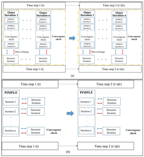 As shown in Figure 10a, the two-way coupling method has a complex workflow, including PIMPLE and outer iterations in each time step. The convergence of the PIMPLE iteration has to be fulfilled first, and then the data communication between the fluid and structure solver will be executed until the outer iterations converge. The strong coupling method still poses difficulties in the present stage due to the large demand for computational effort. Therefore, this study used the weak coupling method as an alternative because it has a simplified workflow, as shown in Figure 10b. As can be seen from the figure that there are no outer iterations required inside the time step; therefore, the communications between the fluid and structure solver can be performed efficiently, which results in a significant reduction in the overall computational cost.