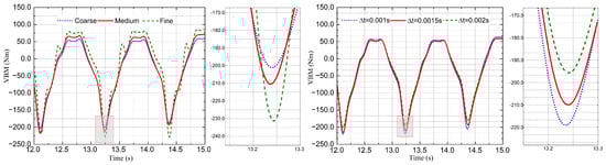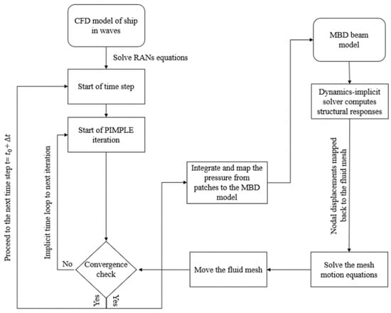 A detailed workflow of the present CFD-DMB approach is shown in Figure 11. At the start of the time step, the PIMPLE iteration is executed first to solve the RANs equations of fluid fields. Until the PIMPLE iteration reaches convergence, the calculated fluid forces and moments at patch surfaces are transposed to the corresponding beam nodes in the MBDyn solver. Then, MBDyn solves the differential equations (Equations (15)–(17)) to compute the structural responses and the structural deformations are fed back into the CFD solver to deform the mesh.