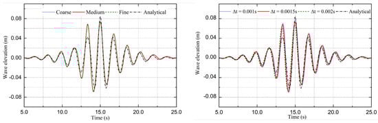 To verify the quality of focused wave modelling, the discretisation error from mesh grids and time steps are studied and summarised in Table 5 and Table 6. The numerical results of wave elevations are further compared with the analytical solution of a focused wave group without current as shown in Figure 12. The figure shows that the simulated focused wave preserves favourable wave shapes, and the peak wave elevation is focused at the focal position and time, as desired. With the consideration on the computational cost, it was concluded that the medium size of mesh and time step of s was the optimum choice to generate the waves in this study.