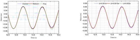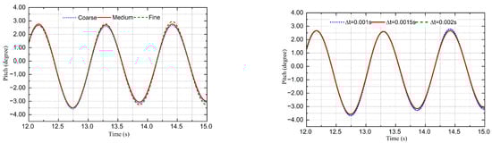 In this verification study, a 2D numerical wave domain extends into two dimensions of m < x < 11 m, m < z < 2 m. A focused wave group was generated with the significant wave height of = 0.12 m, and the wave peak period is chosen as = 1.78 s in the model-scale. The uniform current speed was applied at the boundary inlet with a value of 1.80 m/s, which implies the ship’s forward speed of = 0.275. The focal position was set as x = m, and the focal time was set to be s. The frequency band between Hz to Hz and 50 individual wave components were used to generate this focused wave group. The mesh information of the mesh convergence study was summarized in Table 4.
