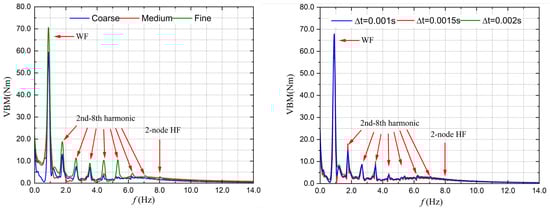 The following section will present two verification studies. In Section 3.1, a sensitivity study is presented on the focused wave generation based on the NewWave theory (Section 2.3), and the numerical results are compared with the analytical solutions. In Section 3.2, a verification study is carried out on the effects of mesh grids and time-step sizes on the present CFD-DMB coupling method at the wave-ship resonance condition (, m). The results, including dynamic ship motions (heave and pitch) and vertical structural loads (VBMs), are analysed in order to justify the correctness and accuracy of the present FSI model.