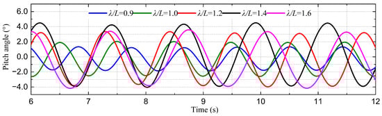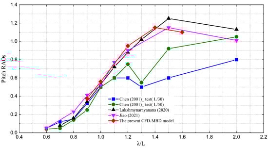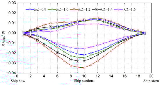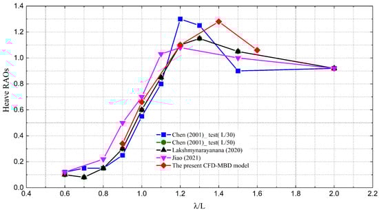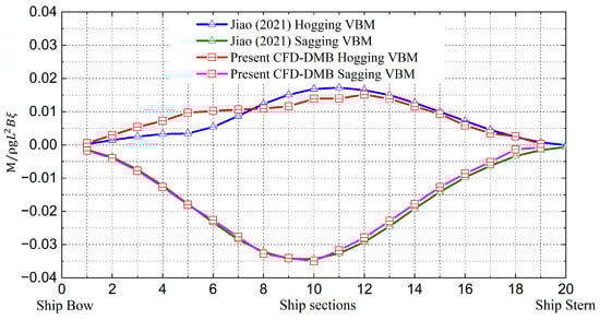However, the abovementioned CFD–FEA coupling method requires significant computational efforts [,], making it difficult to extend applications to more complex wave conditions. Recently, a CFD–DMB method was first proposed by Lu [] on the investigation of the hydroelastic behaviour of a large VLF. The DMB model has a similar setup with the traditional hydroelastic experiments. In this approach, the ship hull is divided into multiple floating rigid sections, whereas a stiffness matrix based on an Euler–Bernoulli (EB) beam theory, equivalently representing the structure’s stiffness, is employed to connect ship neighbouring sections. In this method, only a one-dimensional beam is modelled in the structural solver, and it can significantly save computational time and effort compared with the CFD–FEA method. Based on the above design, the dynamic motion of the ship is both affected by the hydrodynamic forces from fluid solver and restricted by the deformation conditions of the equivalent beam properties from the structural solver. Such a CFD–DMB coupling approach has been applied successfully in the literature—for example, flexible wind turbine blades [] and aircraft wings []. However, in these applications, a single-phase solver is applied to calculate the air forces at the geometry surface with a low mass ratio. For multiphase cases, the DMB method has been successfully employed by Li [] on the dynamic motion of a close-loop WEC array in waves. Lu [] investigated the hydroelasticity of very large floating structures (VLFs) in waves, which was solved in both frequency [] and time domains []. Recently, Bakti [] studied the forward speed effects on the elastic responses of an analytical Wigley hull by using a BEM–DMB coupling method in both regular and irregular waves. According to their results, a noticeable increase of ship vertical bending moments occurs when the ship speed increases due to the whipping phenomenon.