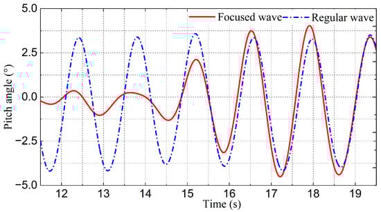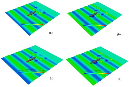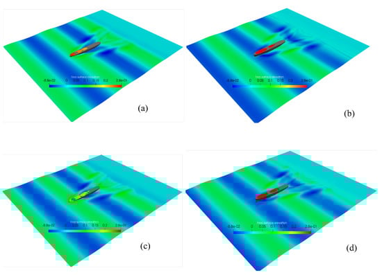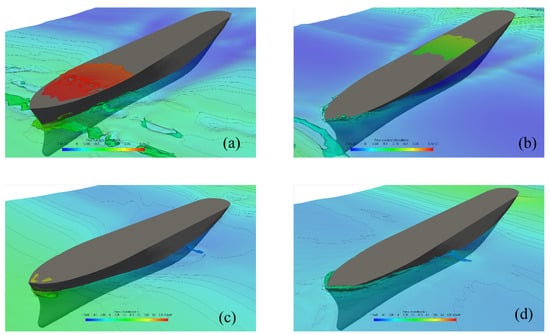 Visual observation of slamming events obtained from the CFD analysis at a wave cycle (t = 17 s–18 s) of the ship in regular and focused wave conditions are shown in Figure 34. The pronounced slamming and severe wave overtopping phenomenon are captured well in the focused wave due to the severe ship responses, whereas they do not appear under regular wave conditions.