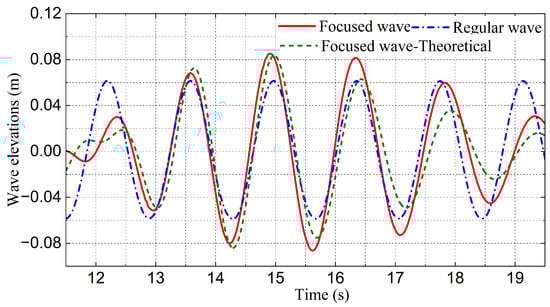 - The focused wave group was generated based on the modified NewWave theory [], considering the current effects. The simulated wave elevations were found in favourable agreement with the theory.