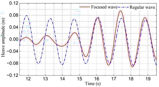 In CFD modelling, a uniform current is often applied at the boundary inlet to simulate the ship forward speed. However, the current effects influence the focused wave modelling, including wave steepness, focusing time and position, owing to the nonlinear interaction between the wave and current []. In the present study, the nonlinear interaction between the wave and current was not considered; therefore, a linear focus wave with the current model proposed by [] was implemented as given in Equation (13). We have