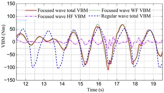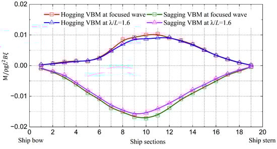 Longitudinal distribution of VBMs along the ship length for regular waves and focused wave groups.