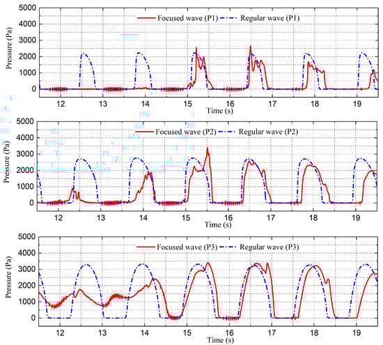 Comparison of the bow slamming pressure between the focused wave and regular wave with wave height = 0.12 m, pressures probes located at P1, P2, P3.